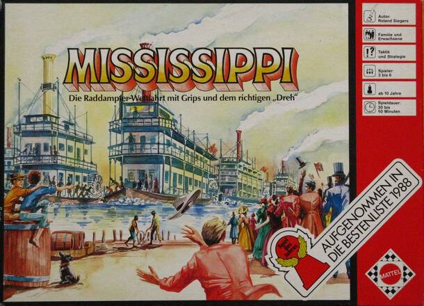 An abstract race game set on the Mississippi river. Each person has a boat (actually a hexagonal piece with the numbers 1-6 written on each of the 6 sides of the piece). The board is a long track of hexes that wind back and forth in an 'S' pattern. Each person places his 'boat' on the start space with one of the numbers facing forwards. Each person also...