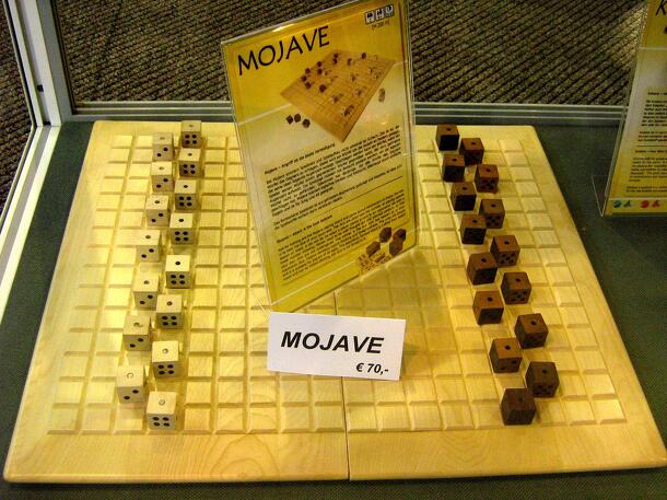 Played on a grid of 15 x 15 squares. Playing pieces are 6-sided dice with "normal" numbers. Each players have 15 dice each. They start in the 3rd and 4th row in a fixed position and orientation. Players move one of their dice each turn as many fields as the number on the top of it in any direction with the opportunity to change direction once...
