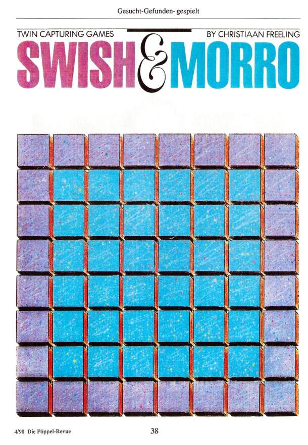 Morro is played on an 8x8 square grid using two pieces per player and 19 neutral pieces. To start the game one player places all four players' pieces on the edge of the board and any number of neutral pieces on non-edge spaces. The other player may then either move first and choose which color to play, or may take the remaining neutral pieces (counting...