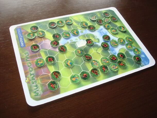 In Mushrooms, players take turns collecting mushrooms on the forest by moving a shared basket. The mushrooms can be good or bad, and thus score positive or negative points. The basket is moved according to some simple rules: You cannot move in the direction of the previous move You must move in a straight line You must land on a space occupied by a...