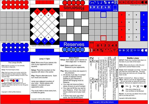 Five games for the price of one (and that one is free!). NanoGames contains five business card sized games. - Battle Lines: Destroy the enemy and invade his base. - Business Card Derby: Destroy your opponent's car before he destroys yours. - Elbow Room: Place and slide your pieces to create a path from your base to your opponents. - Jump-n-Spin: Get across...