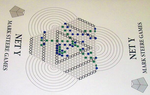 Net Y is an acronym for Nested Tetrahedrons Y. There are three superimposed, interdependent instances of Y which are played simultaneously. Two of the grids are imprinted on tetrahedral shapes, and one is imprinted on a simple triangle. The winner of the majority of the three wins overall. Net Y rule sheet: http://www.marksteeregames.com/Net_Y_rules.pdf...