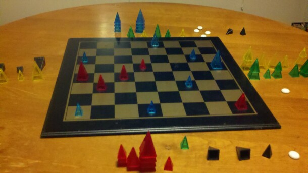 Nickel is a perfect-information strategy game for two players designed to be played with Looney Pyramids. A 5×5 grid is randomly filled at the beginning of the game with 25 pyramids, each of which consists of a unique combination of color and orientation (N, E, W, S, standing-up). Players then alternate turns removing one of the pyramids on the board and...