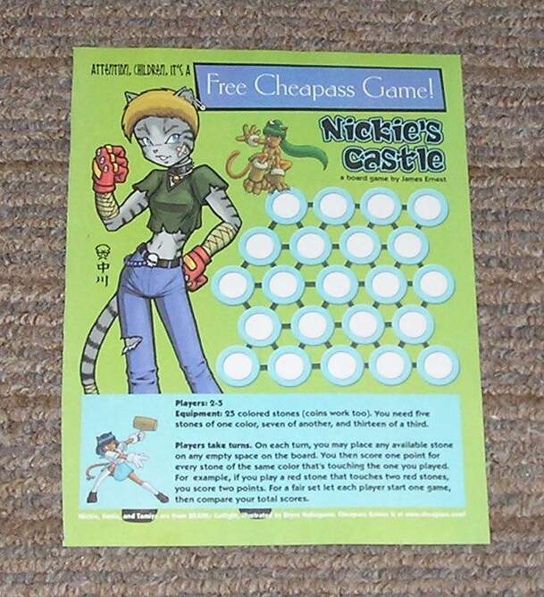 Free Cheapass Game that appeared in the September 2002 issue of Game Trade Magazine. You need to supply 5 counters of one color, 7 of another color and 13 of a third color. In turn, place any available counter on any empty space. Score a point for every adjacent counter of the same color. Most points win. Similar to Putwoody's Castle. Illustrated with...