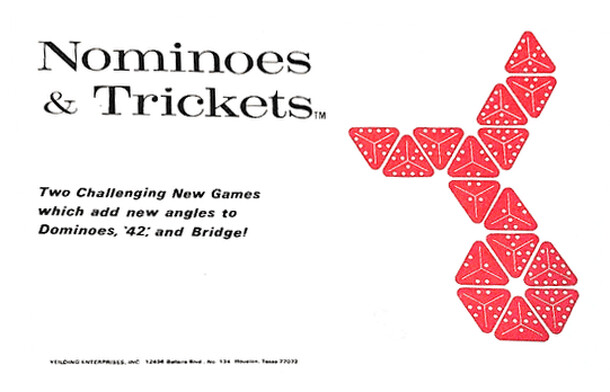 Nominoes & Trickets is a tile-based game that shares some similarities with Tri-Ominos and Trimino. Its red plastic tiles (56 in the 1960s edition, 36 in the 1980s edition) are triangles with zero to five white dots along each side (not in the tile’s corners). In the game’s main variant, "Nominoes", players draw tiles to decide who places the opening tile...