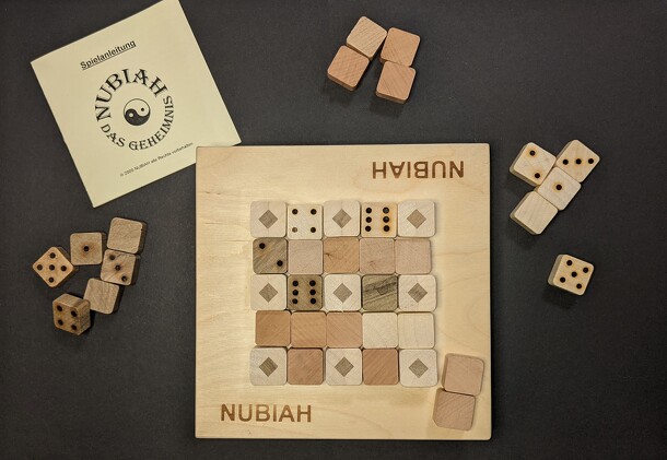 This game was manufactured out of three different types of wood: Walnut, Pear and Acorn which have different colours thus making distinctive tokens. The name NUBIAH results out of the woods german names 'NUss BIrne AHorn'. The playing board is a grid of 5x5 stones. Every second stone is fixed leaving a movable row of neutral tokens between them. This...