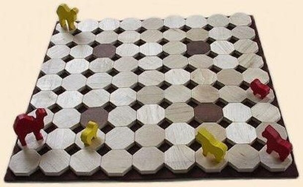 Contents: 1 brown felt game board; 81 wooden octagons (plus one extra piece); 2 camels; 2 zebras; 2 lions; and 1 rules booklet. The Object of the Game: Summary - It's pretty simple: You win if you can make at least one move after your opponent can no longer make any moves. Both players take turns moving one of their three animals (Camel, Zebra, or Lion)....