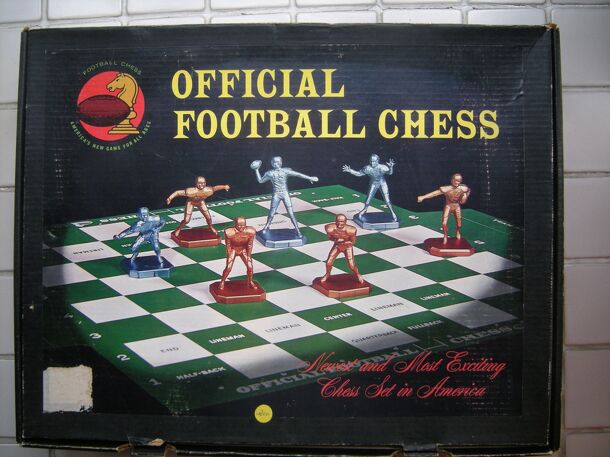 Chess-like game but played with 11 pieces instead of 16. King is replaced by Quarterback. Queen is replaced by Fullback. Rook is replaced by Halfback. Knight is replaced by Center. Bishop is replaced by End. Pawn is replaced by Lineman. Capturing a piece is "blocking a man out of play". Castling is "quarterback protection". Check is "Quarterback under...