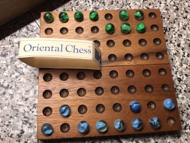 In this abstract strategy game, each player has 8 identical pieces. They move like rooks, but can't jump over any pieces or land on pieces. Instead, you can capture opponent's pieces either by inclusion of a string or by connecting two strings on a line. You win if you reduce your opponent to at most one piece, unless they can reduce you to at most one...