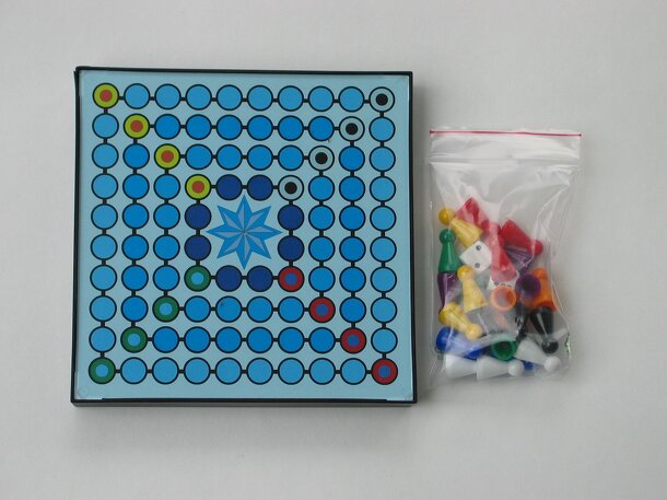 Osmosis is a race game from the corners to the center of the board driven by two six-sided dice. Pieces‘ way may be shortened when reaching certain positions: Two own pieces of different colors must reach the same cell or the cell lying exactly opposite on the same ring. That player wins who manages to bring both a man of his two different colors to the...
