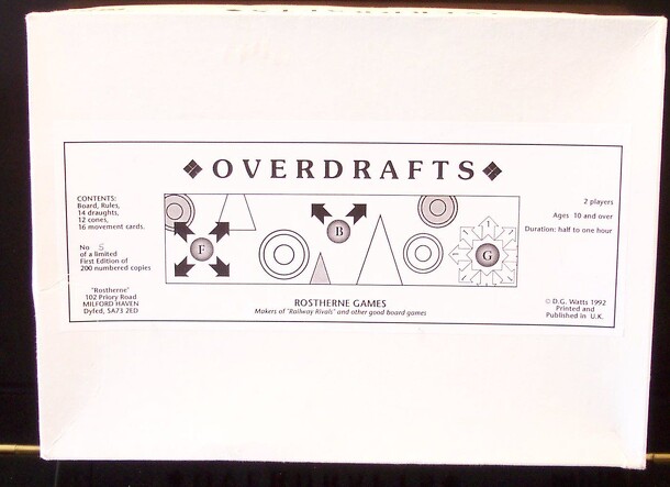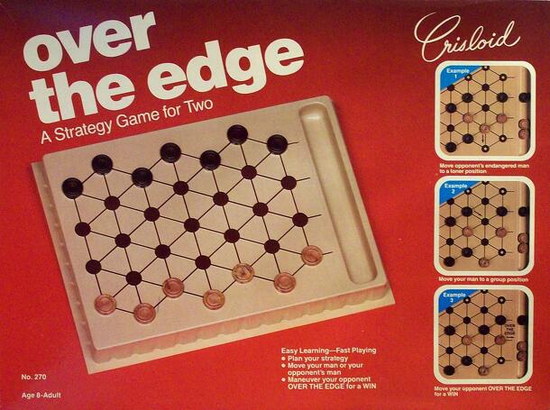 This game is one of a series of 2 player strategy games by Lakeside from the 1970's, also including Blockade, Trespass, and Isolation. In Overboard, the "Slide to Survive" game, the board is a 7x7 grid of squares with slots between them to create a grid of 6x6 or 36 playing positions. There are 36 pieces, 18 red, 18 white, which are placed on the...