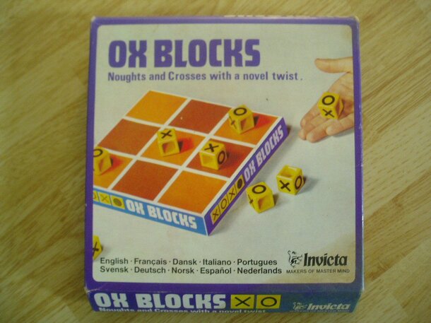 From the box: Ox Blocks is a game for 2 players. The object is to make a straight line of X's or O's horizontally, vertically or diagonally. One player elects to play X's, the other O's. Either player may start by rolling any one of the Ox Blocks. If a player throws his own symbol (X or O) he may place it on the board in any position he wishes. If he...