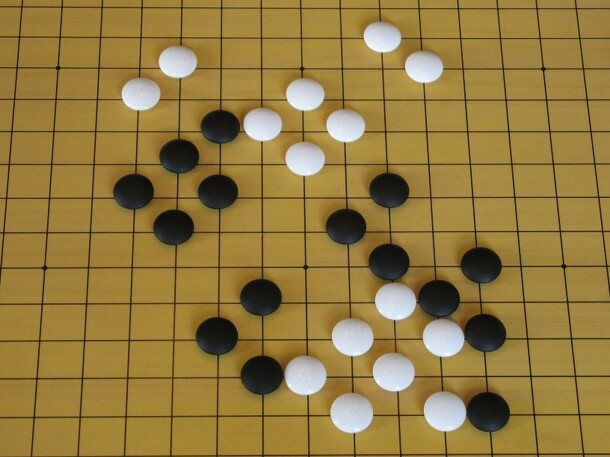 Palisade is played with a Go set. Points available to Player 1 are interspersed with points available to Player 2 in a checkerboard pattern. When you form a loop which surrounds enemy stones, you remove the enemy stones from the board. Neither player may place stones into a loop. A player owns the perimeter of his loop as well as all of the points...