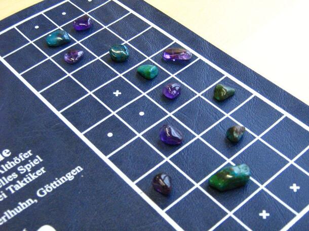 On a small board 4 x 10 squares there are six little half-precious stones for each player in their starting position: three in the first of the four-square-rows, leaving the rightmost square unoccupied and three in the sixth row, leaving the leftmost field unoccupied. The direction of play is "the long run", so the second row of each player is already...