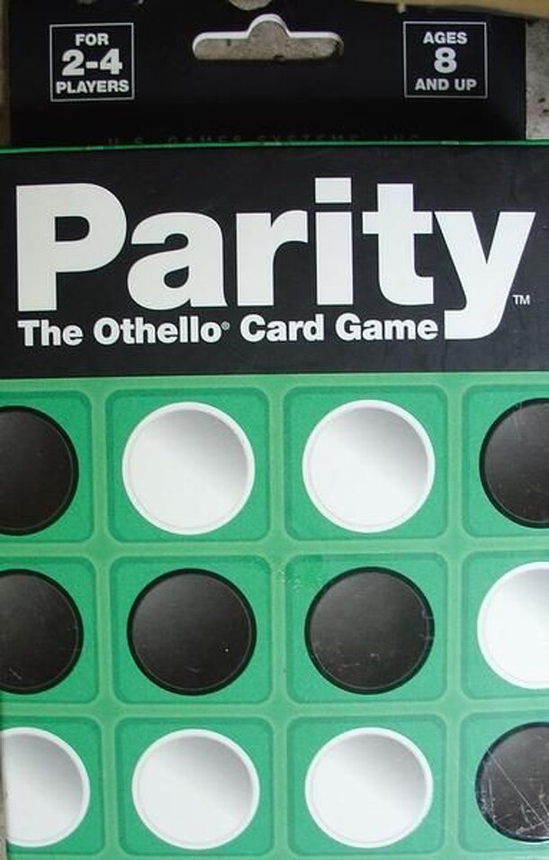 Subtitled "The Othello Card Game", Parity consists of a deck of 51 cards, each containing a 2x3 grid of black and white Othello pieces, plus a Centerpiece Card containing the familiar starting pattern of two black and two white. The game is played in rounds, in which each player plays one card on the table adjacent to the Centerpiece Card or previously...