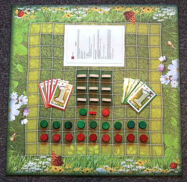 The gameboard has recesses into which you initially fill the small red and black disks. Over the course of the game, you move all your big playing pieces to the other side of the board as quickly as possible. You only move diagonally over disks and playing pieces of your own color, but you may change directions anytime. Your turn always ends on a disk of...