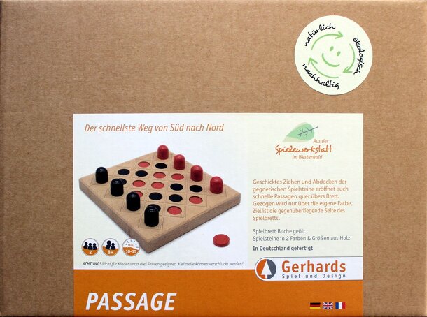 Passage is a connection game played on a 20x20 square grid. Each player has an identical (except for color) set of polyominoes - three each of the seven shown. The pieces have semicircles along their edges. Players are attempting to construct a path of their pieces between two opposite edges of the board. When pieces are next to each other their...