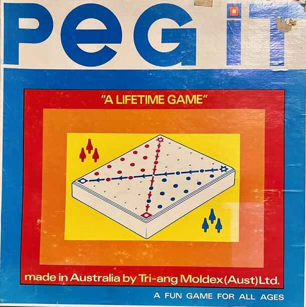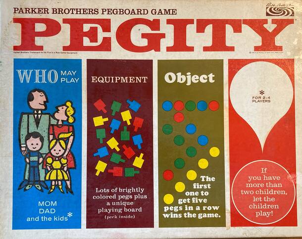 An oldie. Pegity is a game where players insert wooden pegs into a punch board. The object is to get five pegs of your color in a row. There are also little pieces of paper inside with designs on them, such as a house, doll boat, etc... which younger children could make with the game's contents instead of actually playing the game. Not a particularly rare...