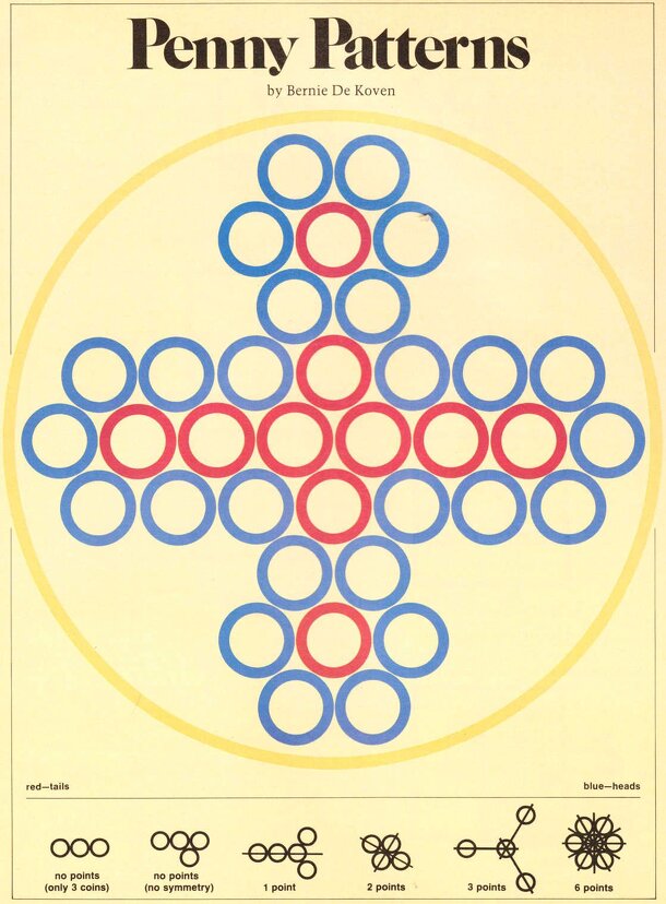 Penny Patterns is played with thirty-six pennies on a board made up of blue and red circles. On each turn the active player flips a penny and places it in a red (inner) circle if it comes up tails and a blue (outer) circle if it comes up heads. Placing in a blue circle entitles a player to go again. The object is to form symmetrical patterns of at least...