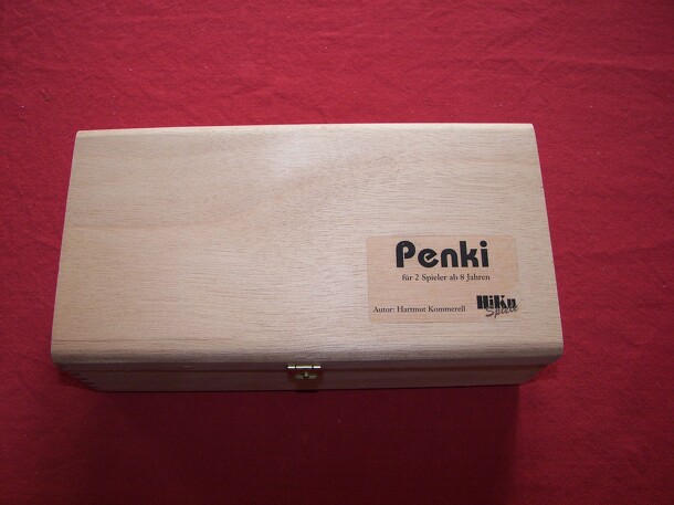 Penki is a tactical, dynamic 5-in-a-row game. As with most 5-in-a-row games, each player strives to create a row of 5 pieces of her color. In Penki, however, there is a 3rd color which is wild, and all the pieces wait, hidden in a bag, to be drawn. Each Player owns 14 pairs of pieces, randomly drawn from the bag. On your turn, you either add a new board...