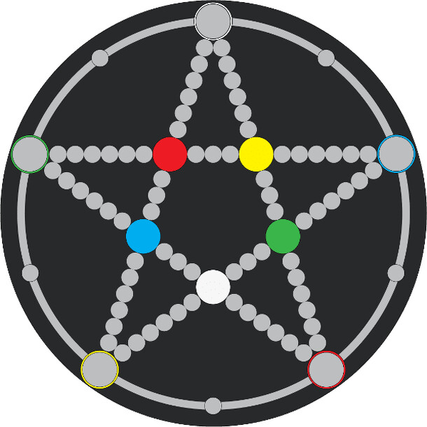 Pentagame is an abstract strategy game without chance element. It is played on a pentagram star that shows 100 round stops. The 5 corners and the 5 crossings in the pentagram are colored (white, blue, red, green, yellow). It can be played with 2, 3 or 4 players. It looks a bit like a pentagonal ludo, but it is truly different. For example, there is no...