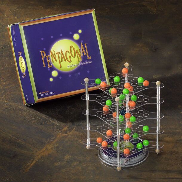 Pentagonal is a 3-D, five-layer game that challenges players with complex strategies, yet is deceptively simple to learn and play. The object of the game is to place five marbles in a row either vertically, horizontally, or diagonally. The challenge of the game is to master the mind-boggling number of combinations and permutations possible with every move....