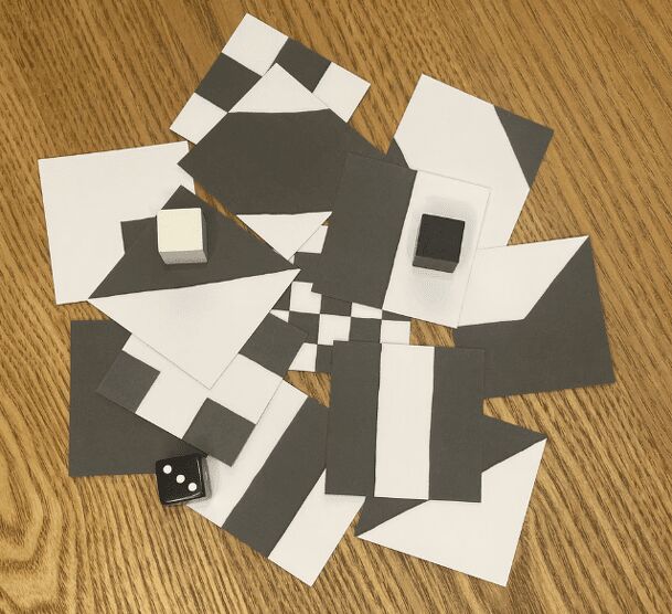 Described in Parlett's The Oxford History of Board Games. The game has 144 squares in three colors (12 x 12 grid) and each player has twelve pieces, four of each color, the players are differentiated by shape. Pieces move in any orthogonal or diagonal direction one space, or over an unbroken line of pieces of any shape or color, provided it lands on its...