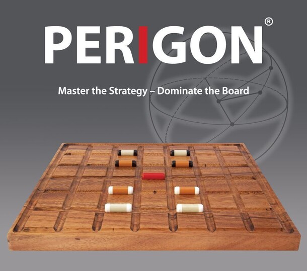 Perigon is a two-player strategy game. The board is a seven-by-six grid with grooved grid lines. The intersections of the grid are known as Hubs. The pieces are solid cylinders that lie in the grooves of the board in between the Hubs. The grooves that lie along the longer edges of the board are the goal lines. Each player has two Woods and two Granites...
