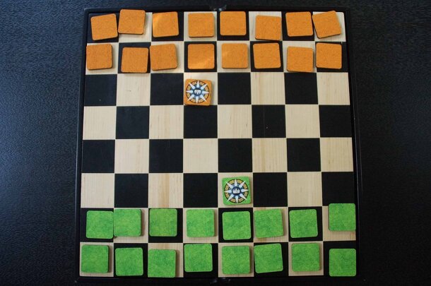This game was created for a design contest as documented here: http://boardgamegeek.com/article/13809424#13809424 The game is played on an uncheckered board of 8 rows and 12 files; the game does scale though to boards of smaller size. Each player starts the game (sitting across the board from one another facing a long side of the board) with 12 stones...