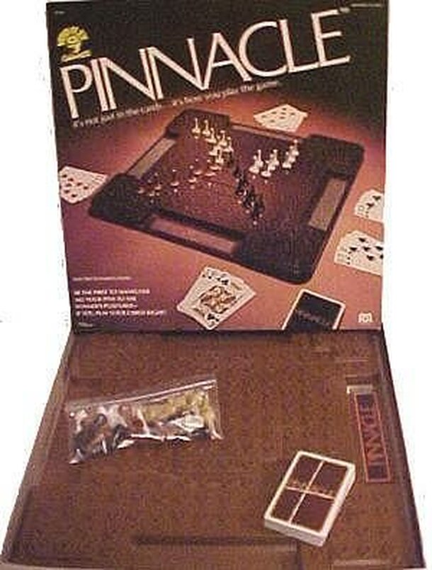 Pinnacle is a rummy-type game using a standard deck of 52 cards, valued Ace - 9 = 1/2 pt. and 10 - King = 1 pt. Each player draws a hand of 7 cards and on his turn, may draw from the face-down draw pile or from the perfect knowledge discard pile, taking any card plus all others above it. When the player has a sequence of at least 3 cards of the same suit...