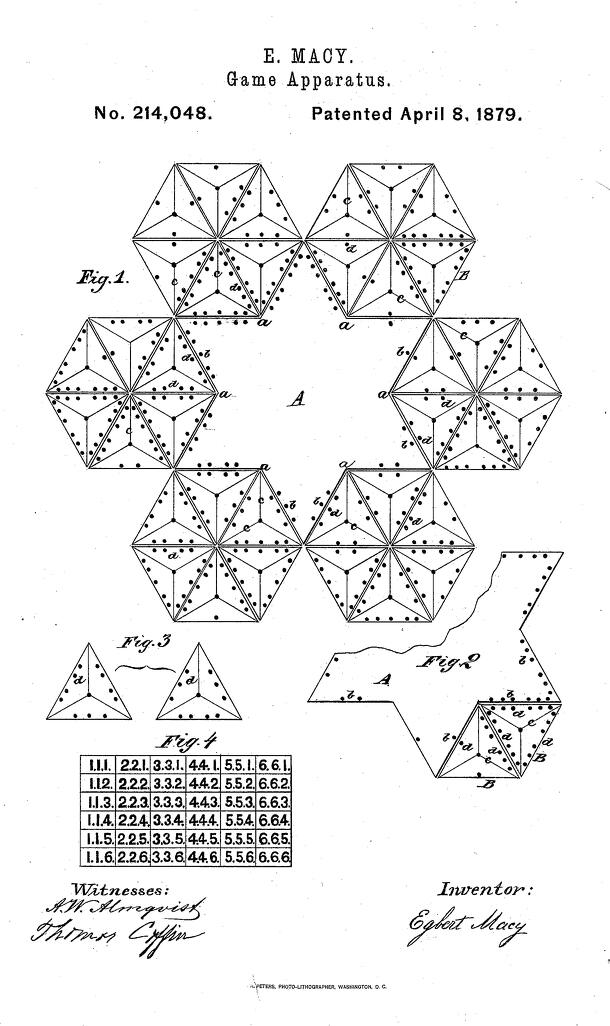 Pleiades, an early adaptation of dominoes to triangular pieces, was granted a patent in 1879. The game consists of a central six-pointed star piece, each point being marked on both outer edges with a number of dots from one to six, and thirty-six triangular tiles marked along their edges with numbers ranging from one to six. To begin the game, the tiles...