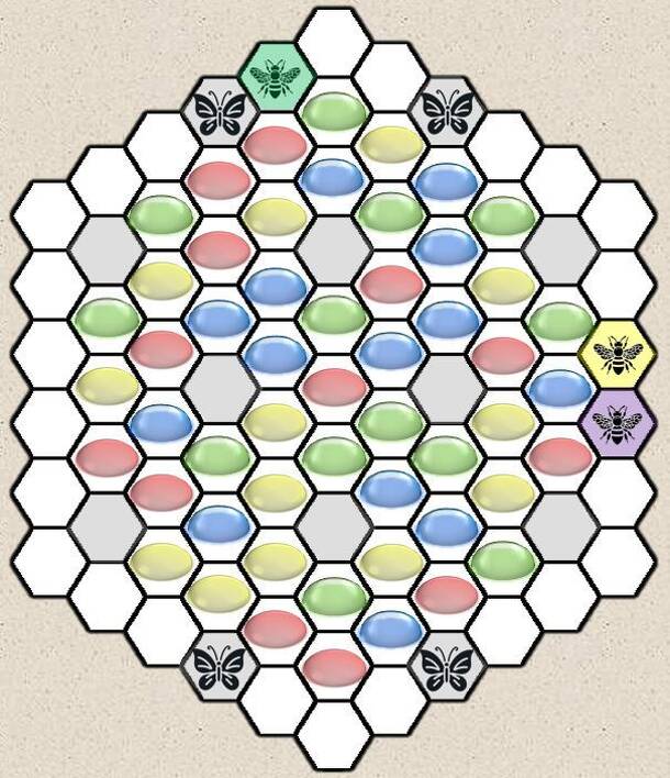 Gameplay On their turn, a player takes 2 actions: Moving a Bee Bees jump like a knight in chess. If a Bee lands on a hex with Pollen, the player collects it and performs any associated action. Moving a Butterfly After moving their Bee, the player moves a Butterfly. Butterflies also move like a knight in chess. If a Butterfly lands on a hex with a Bee, the...