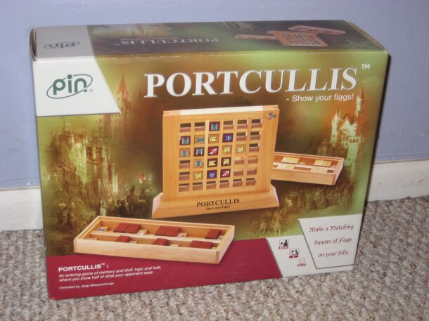Portcullis features an upright wooden board shaped like a castle gate, which is very thick to prevent players from seeing each other’s pieces before placed. It has a 6x6 grid of holes into which 36 playing blocks—18 dark, 18 light—can be pushed. There are two wooden trays for each player to sort their wooden playing blocks. (When not in use, the pieces...