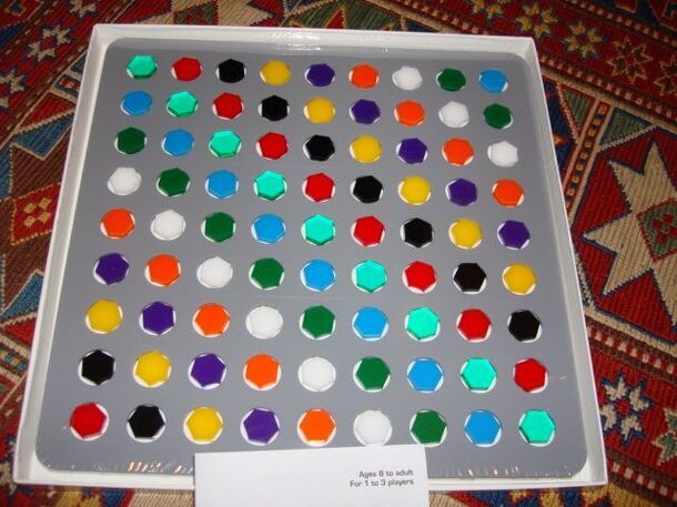 Pseudo-Coup is another Sudoku-based game. Probably the most beautiful one made. The acrylic nine by nine grid includes laser-cut pieces in nine colors. This allows standard Sudoku to be played with colors instead of numbers (much more pleasing to the eye), and also includes rules for games with up to nine players based on square grids, triangular grids...