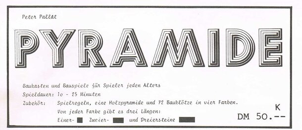 The game consists of a wooden step pyramid and 72 wooden bricks in three sizes and four colors. There are four sets of game rules included, three of them dealing with building the pyramid (= laying the bricks onto the wooden gameboard until it is completely covered), one with dismantling it. - In the first variant, the color of each layer is fixed. Players...