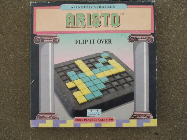 From the back of the game box: Contents: Original plastic playing board plus 64 two sided (yellow and green) playing pieces, plus game instructions. Aristo - The Game The AIM - to try to end the game with a majority of your color pieces on the board. Aristo is a game of wits. You have to outwit your opponent, overturn as many of his pieces as possible in...