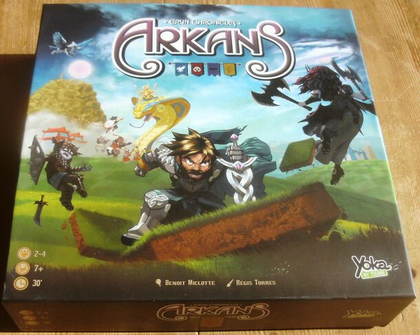 Abstract game set in a fantasy world. Each player has 20 square tiles and each tile is numbered on all 4 sides. On your turn, you place a tile from your hand onto the board with a 5 by 5 grid. The placed tile must be adjacent to at least another tile already placed with all adjacent numbers matching (with the effect that you refill your hand) or (partly)...