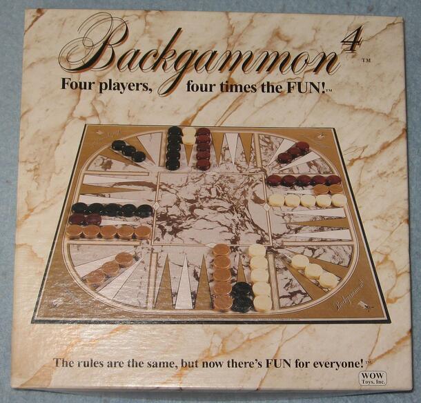 A nice-looking variant for four players, by the same company that produced Four Player Chess. Picture a "rounded square" with six backgammon points on each side of the square, then add three new points in each corner. The board is reversible, with traditional backgammon on the reverse side. Regular backgammon rules apply for movement. The setup is slightly...