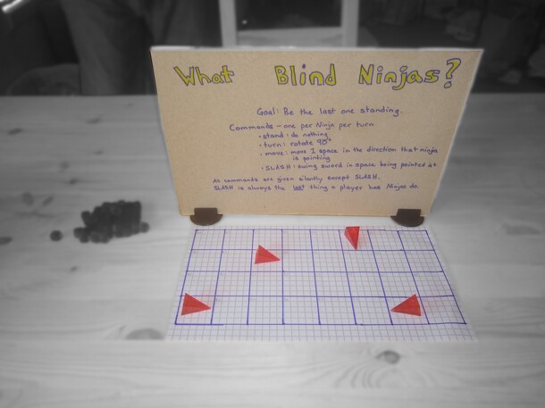 Each player has sent their ninjas into a room to hunt the enemy ninjas. Unfortunately the ninjas are blind and can only use their amazing sense of hearing to locate enemies. What Blind Ninjas? is a battleship style game where the players send their blind ninjas out to hunt their opponents ninjas. Players use deduction and the knowledge of their opponents...