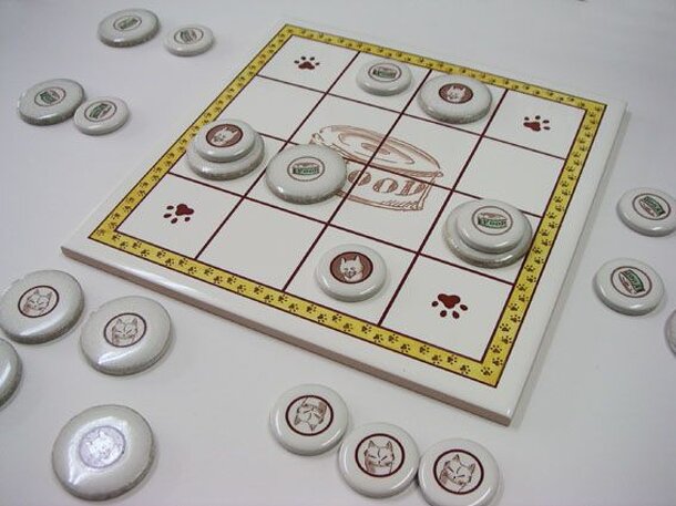 The game is played by controlling a dog and a cat on a 4x4 board to obtain high-scoring canned food pieces. The game incorporates elements of Scissors Shogi, Sanme-jabira, and a chain reaction system. The game can be played by 2 to 4 players. Pieces Each piece is printed with 3 illustrations of a dog and a cat, and 6 illustrations of a canned food. The 12...
