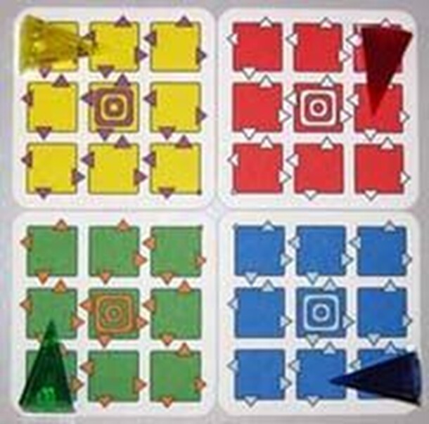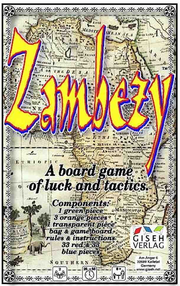 Zambezy ... a board game of strategic placement and points accumulation using luck of the draw and tactics. The object is to accumulate points by placing or exposing pieces of the same colour on four adjacent spaces to form squares. Pieces may be placed on top of others but only on opposing-colour pieces - maximum: 4 high. Only same-colour pieces on the...