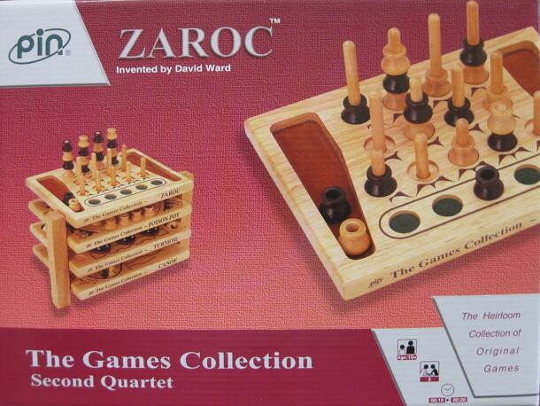 Selection #5 of The Games Collection by Pin International. Zaroc is a 3-dimensional game for 2 players. The object is to descend from the heights in the back, down to the lowest pegs, and then jump off at an opportune moment, to ultimately control three of the winning spots. The game starts with pieces arranged in alternation on the tallest pegs. A piece...