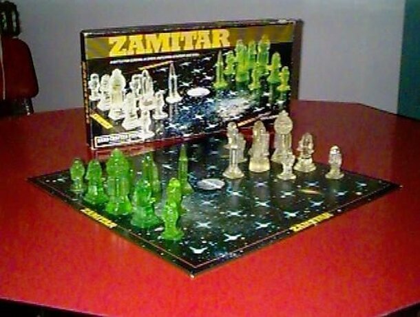 Zamitar is a chess style game with very 70’s inspired sci-fi acrylic pieces. Each piece has it’s own move, as in a normal chess game. The difference being that a few of the pieces can bounce their moves off the walls. To win you must take the opponents Space Station piece. The astronaut piece definitely has a “Danger - Will Robinson” (from the old LOST IN...