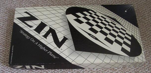 This two player abstract strategy game is played on a standard eight by eight Chess board, though the board is oriented diagonally. Each player is given an equal force of pieces in a different color -- five tall hexagonal Wall pieces, ten numbered Zin pieces (four 2's plus one of each of the other numbers between 1 and 7), and an unnumbered Rogue Zin...