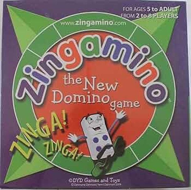 Zingamino is dominoes with a twist. It is played on a board with four interconnecting circles. The game uses domino-like tiles with colored dots in four colors - orange, green, purple and yellow - and 16 tiles in each group that must be played in the corresponding colored circles. The connecting colored circles can be bridged with doubles tiles or "wild"...