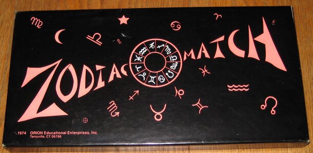 This game features 96 "domino" tiles, consisting of different pairings of the 12 zodiac symbols. Each symbol appears red and black. Twelve of the tiles have stars at one end and are "wild". 2 to 4 players play, each using a rack of 6 tiles. Tiles can be placed anywhere in the layout provided that they match the same symbol in opposite color of at least one...