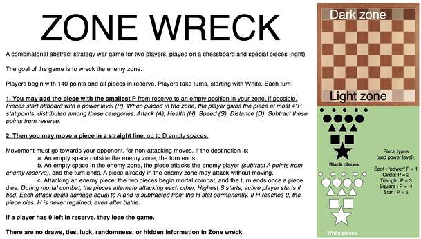 Zonewreck is a a combinatorial abstract strategy war game for two players, played on a chessboard and special pieces. The goal of the game is to wreck the enemy zone. Players begin with 140 points and all pieces in reserve. Players take turns, starting with White. Each turn, players optionally perform these two actions: You may add the piece with the...