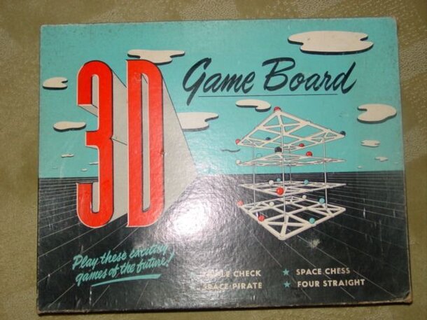 This is actually four games in one: Four Straight - 3-D Tic-Toe variant for up to 4 people. Indicates no tie ever on record ;-) Triple Check: a 3-D checkers variant. For 2 players. Space Pirate: A 3-D chase game - evidently similar to farmer and the Pig. For 2 players. Space Chess: This really is the rules only as it states in the rules that the chess...