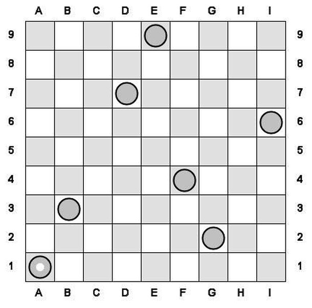 This game is played on an empty 9x9 square board with 81 stones of just one color. Turns - At each turn, each player drop a stone at an empty cell. * For every 3 stones in any line (orthogonal or diagonal) the player gets 1 point; * For every 6 stones in any line (orthogonal or diagonal) the player gets 2 points; * For every 9 stones in any line...