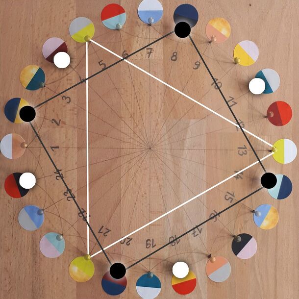 The game is packed in a can. Content: 57 stones in different colors, 9 cards with 4 rings at it In the basic game with 2 players one gets 18 red, the other 18 green stones. The cards have to be laid in a square. Alternately each player sets a stone onto a ring of one of the square cards. The valuation starts after 3 stones: One point for 4 stones on one...